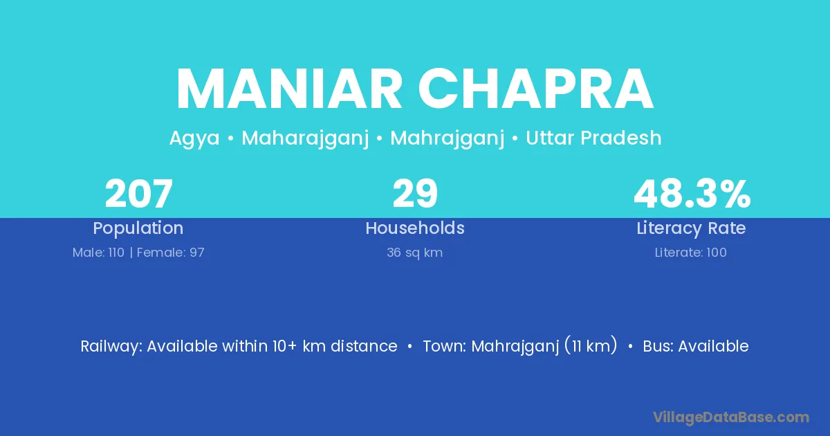 Mahrajganj (11 km) is the nearest town to Maniar Chapra village for major economic activities and is located approximately 11 km away.