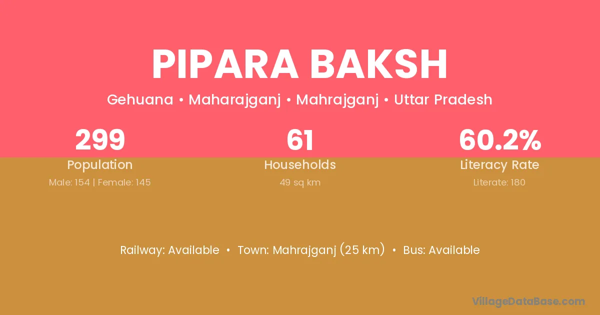 Mahrajganj (25 km) is the nearest town to Pipara Baksh village for major economic activities and is located approximately 25 km away.