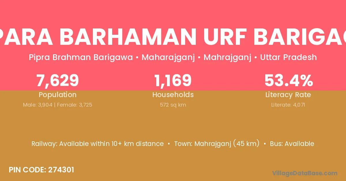 Mahrajganj (45 km) is the nearest town to Pipara Barhaman Urf Barigaon village for major economic activities and is located approximately 45 km away.