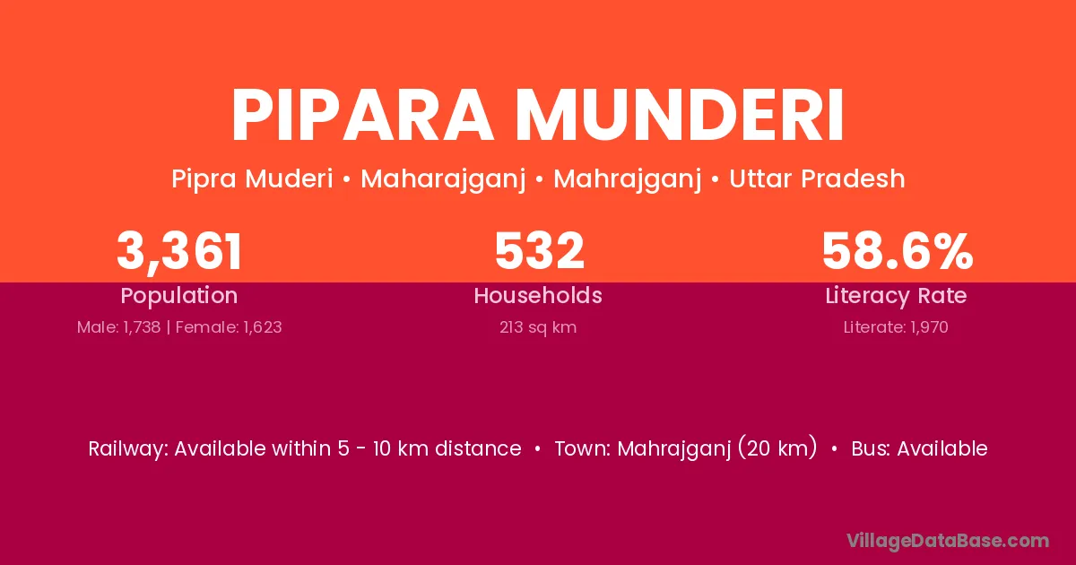 Mahrajganj (20 km) is the nearest town to Pipara Munderi village for major economic activities and is located approximately 20 km away.