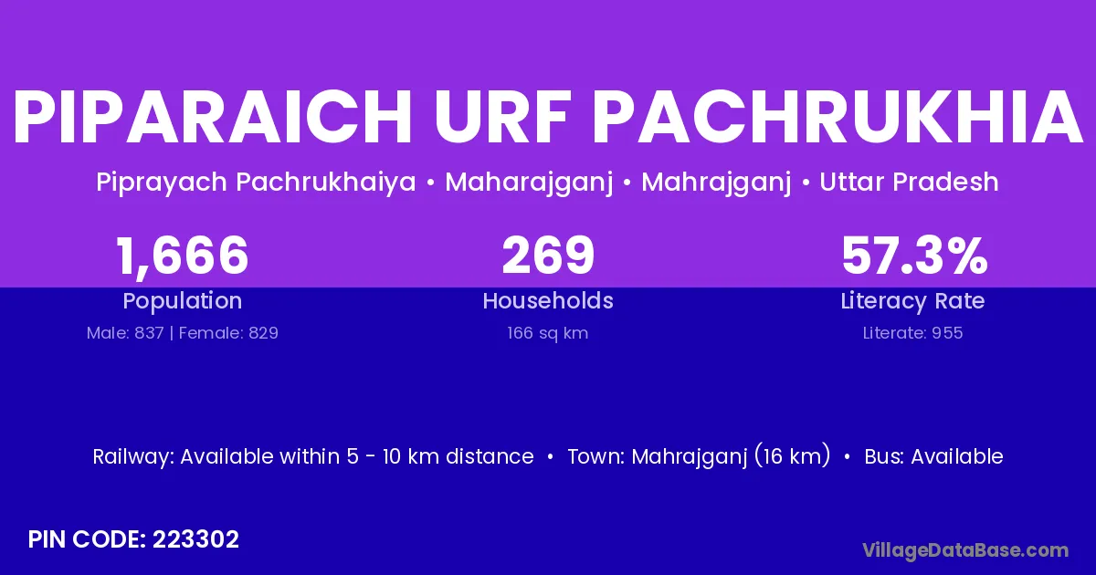 Mahrajganj (16 km) is the nearest town to Piparaich Urf Pachrukhia village for major economic activities and is located approximately 16 km away.