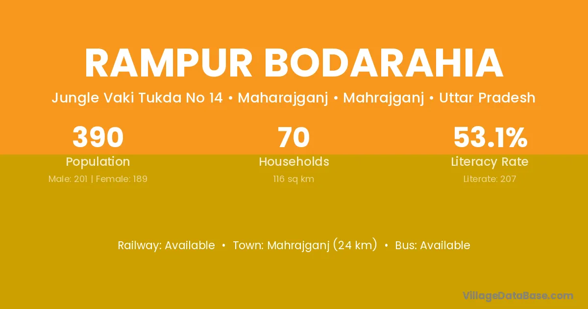 Mahrajganj (24 km) is the nearest town to Rampur Bodarahia village for major economic activities and is located approximately 24 km away.