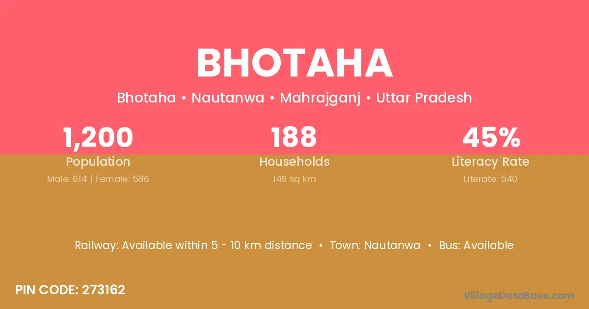 Bhotaha village has a total population of 1,200 people, of which 614 are males and 586 are females.