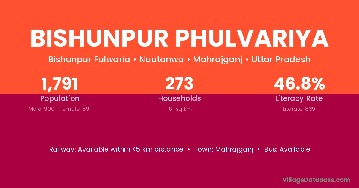 Bishunpur Phulvariya village has a total population of 1,791 people, of which 900 are males and 891 are females.