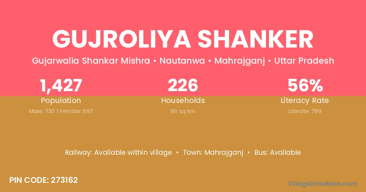 Gujroliya Shanker village has a total population of 1,427 people, of which 730 are males and 697 are females.