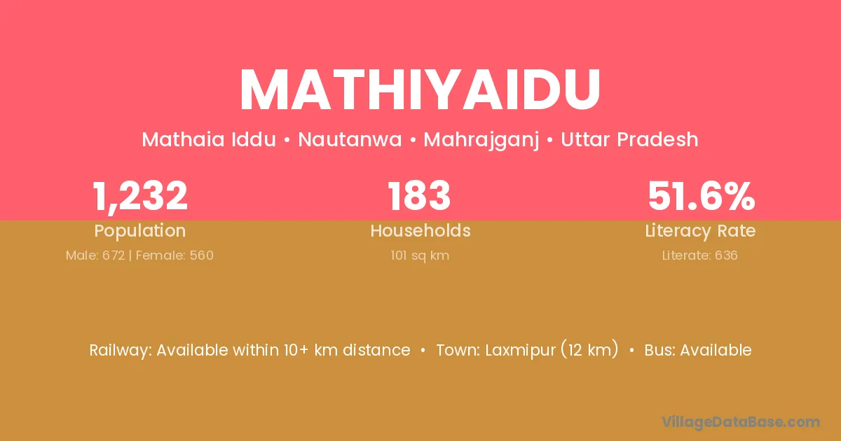 Mathiyaidu village has a total population of 1,232 people, of which 672 are males and 560 are females.
