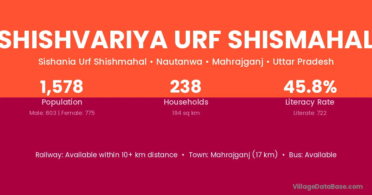 Mahrajganj (17 km) is the nearest town to Shishvariya Urf Shismahal village for major economic activities and is located approximately 17 km away.