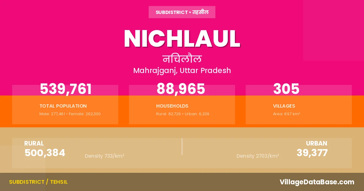 According to the 2011 census The total area of Nichlaul Tehsil is 697 km², with a population of 539761 people. The population density is 775 inhabitants per square kilometre, and there are approximately 88965 houses in the sub district.