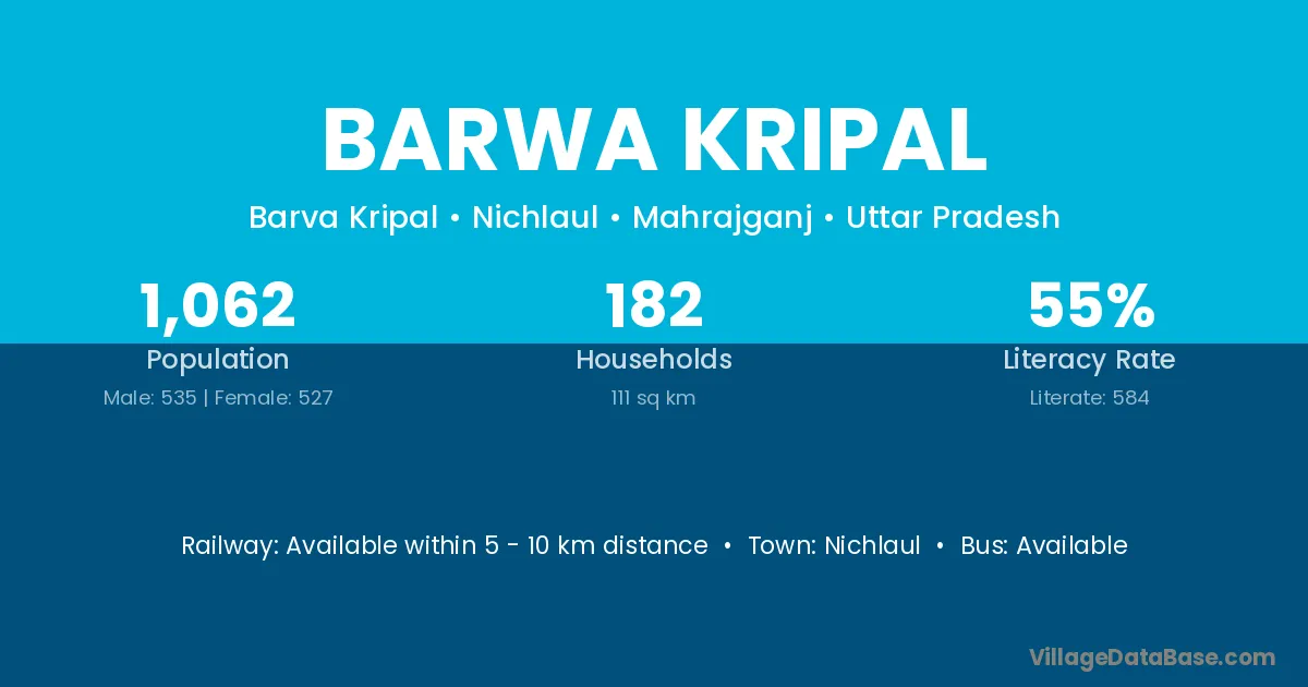 Barwa Kripal village has a total population of 1,062 people, of which 535 are males and 527 are females.
