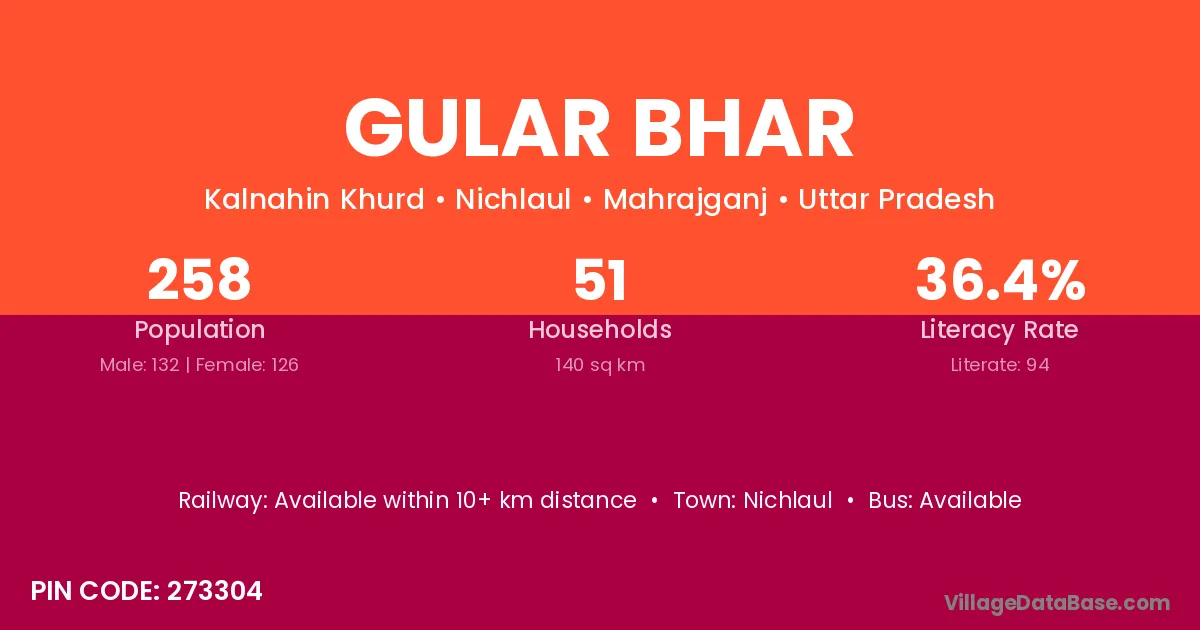 Gular Bhar village has a total population of 258 people, of which 132 are males and 126 are females.