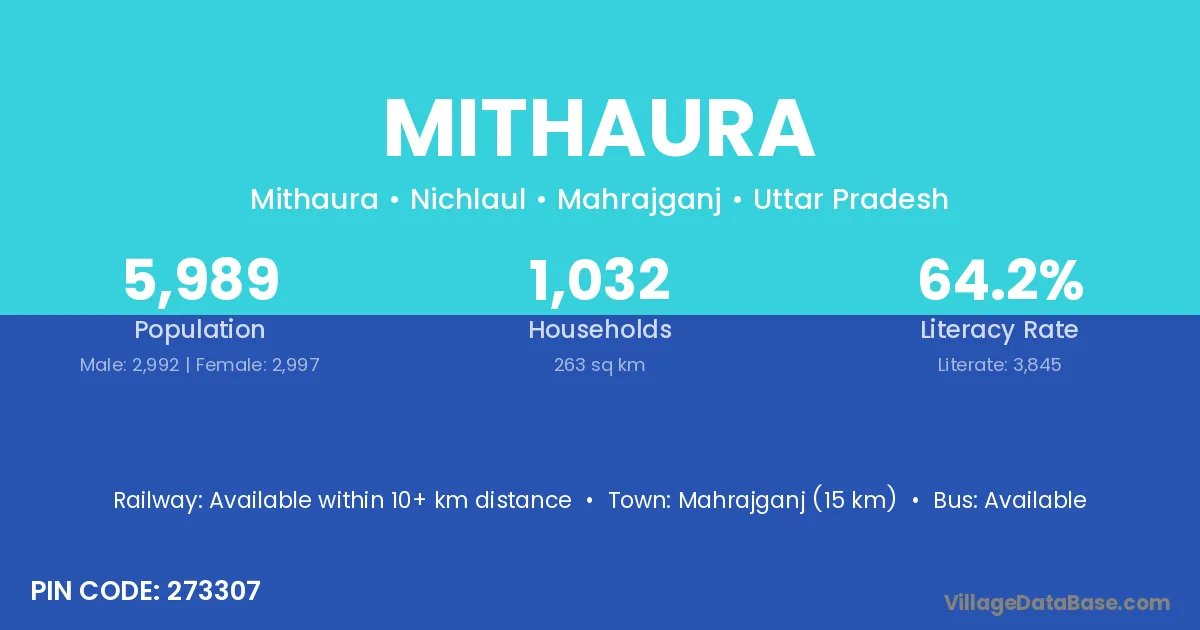 Mahrajganj (15 km) is the nearest town to Mithaura village for major economic activities and is located approximately 15 km away.