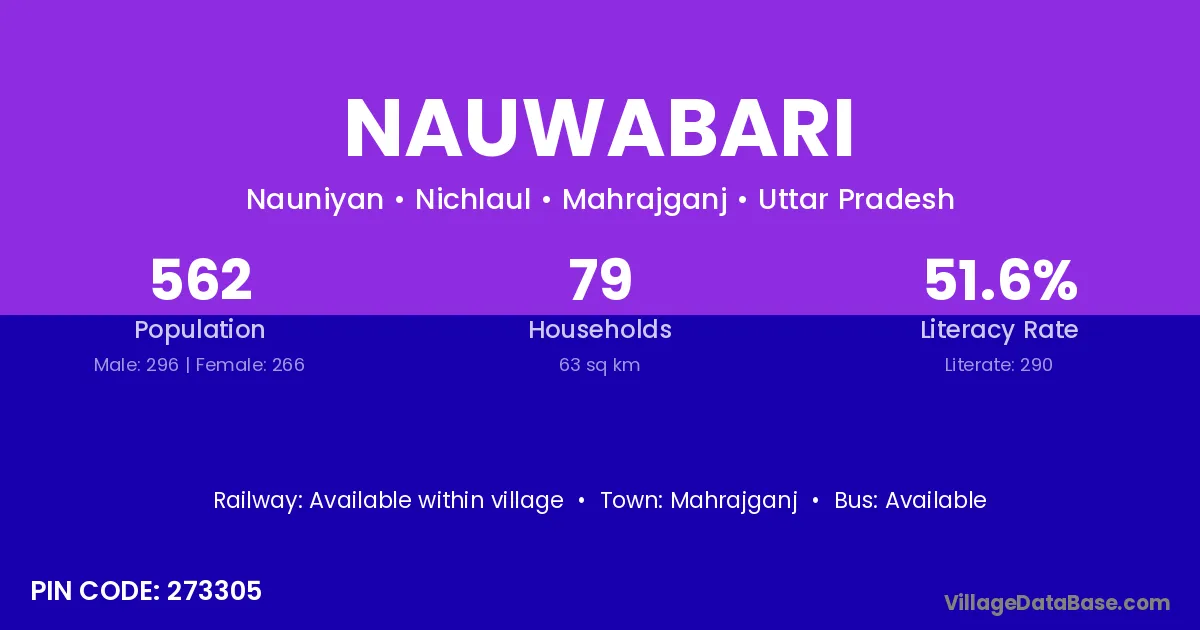 Nauwabari village has a total population of 562 people, of which 296 are males and 266 are females.