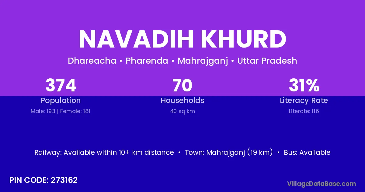 Mahrajganj (19 km) is the nearest town to Navadih Khurd village for major economic activities and is located approximately 19 km away.