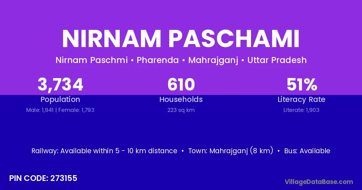 Mahrajganj (8 km) is the nearest town to Nirnam Paschami village for major economic activities and is located approximately 8 km away.