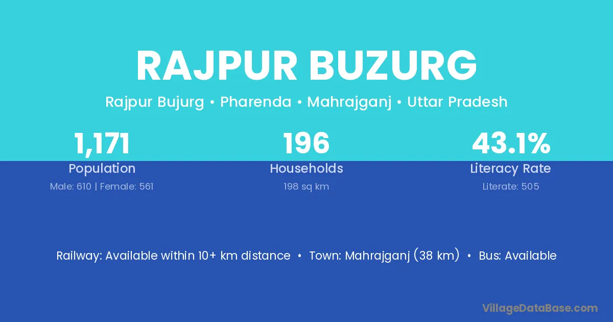 Mahrajganj (38 km) is the nearest town to Rajpur Buzurg village for major economic activities and is located approximately 38 km away.