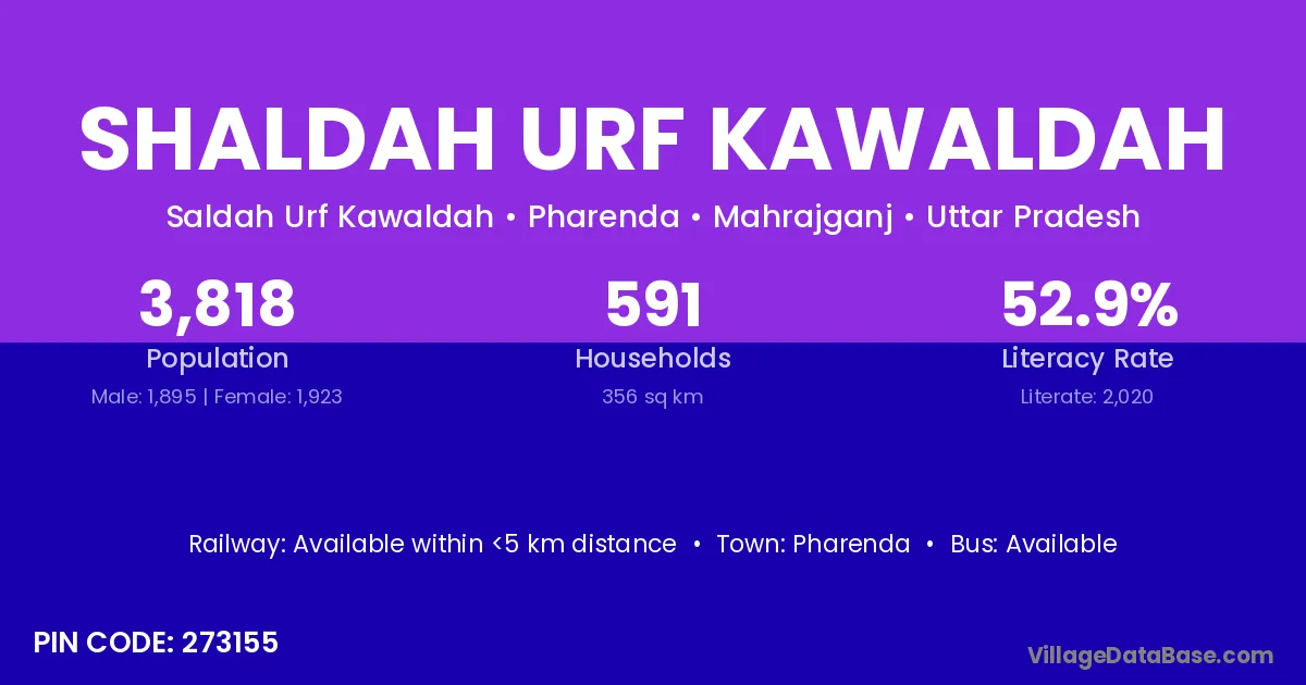 Shaldah Urf Kawaldah village has a total population of 3,818 people, of which 1,895 are males and 1,923 are females.