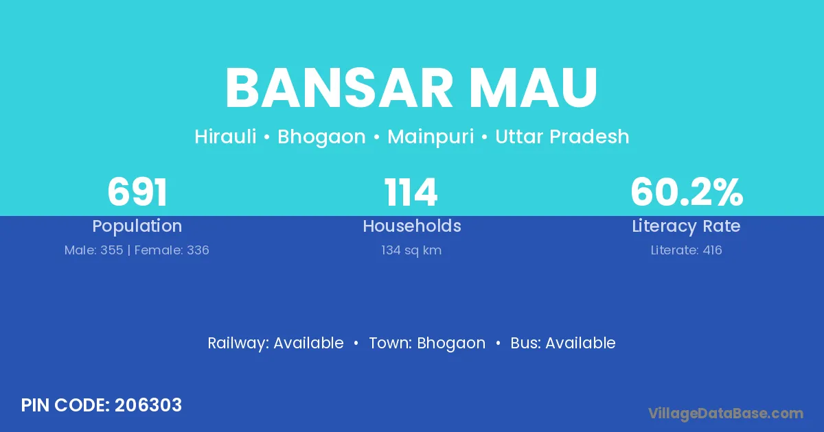 Bansar Mau village has a total population of 691 people, of which 355 are males and 336 are females.