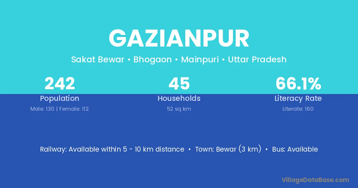 Bewar (3 km) is the nearest town to Gazianpur village for major economic activities and is located approximately 3 km away.