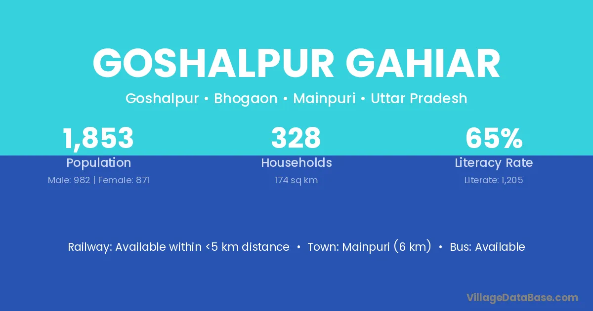 Mainpuri (6 km) is the nearest town to Goshalpur Gahiar village for major economic activities and is located approximately 6 km away.