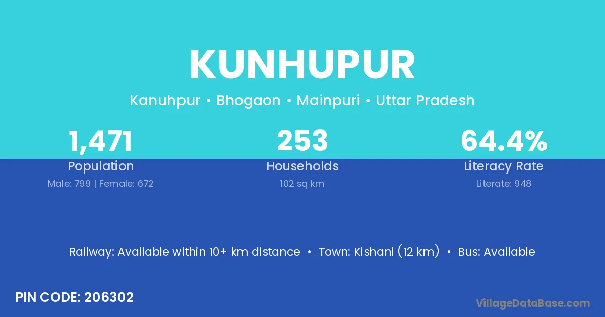 Kishani (12 km) is the nearest town to Kunhupur village for major economic activities and is located approximately 12 km away.