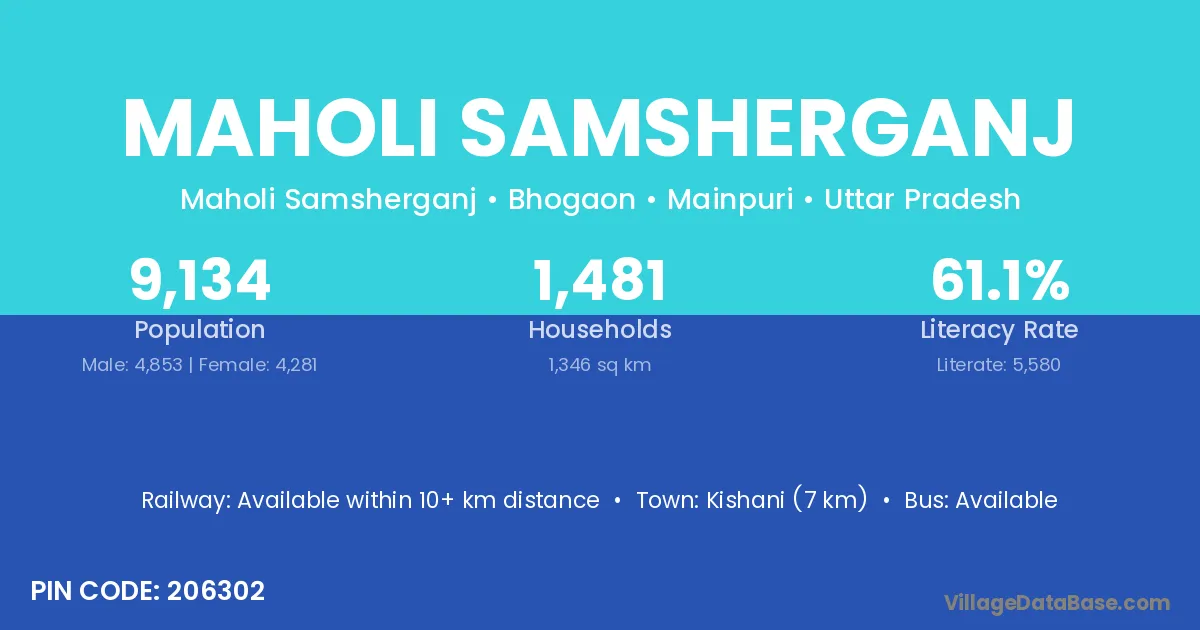 Maholi Samsherganj village has a total population of 9,134 people, of which 4,853 are males and 4,281 are females.