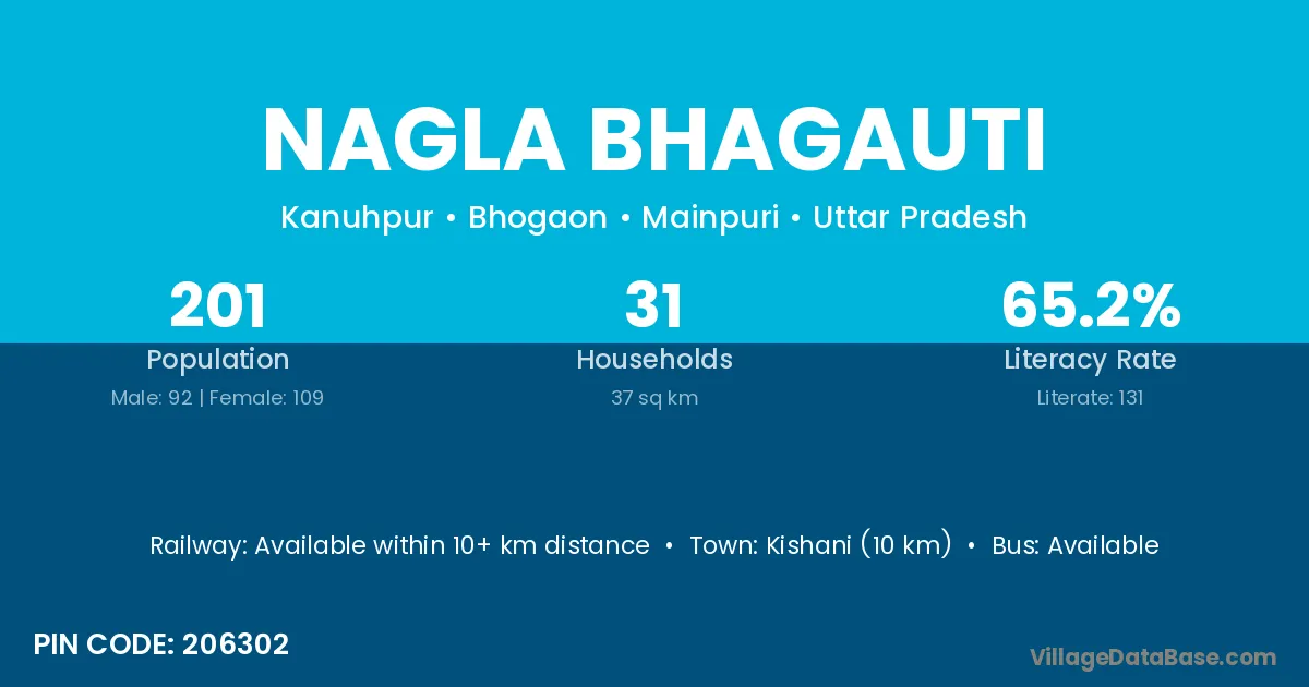Nagla Bhagauti village has a total population of 201 people, of which 92 are males and 109 are females.