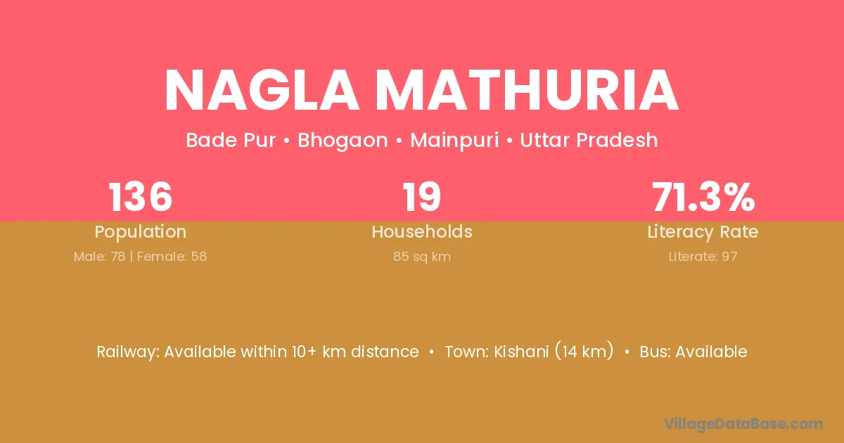 Kishani (14 km) is the nearest town to Nagla Mathuria village for major economic activities and is located approximately 14 km away.