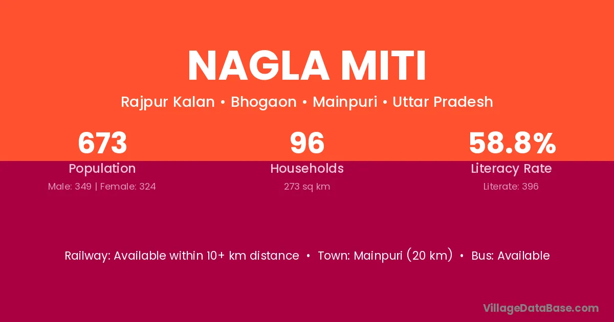 Mainpuri (20 km) is the nearest town to Nagla Miti village for major economic activities and is located approximately 20 km away.
