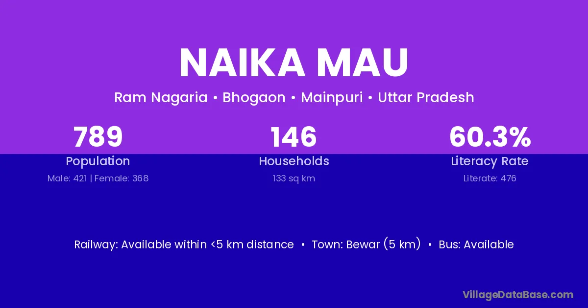 Bewar (5 km) is the nearest town to Naika Mau village for major economic activities and is located approximately 5 km away.