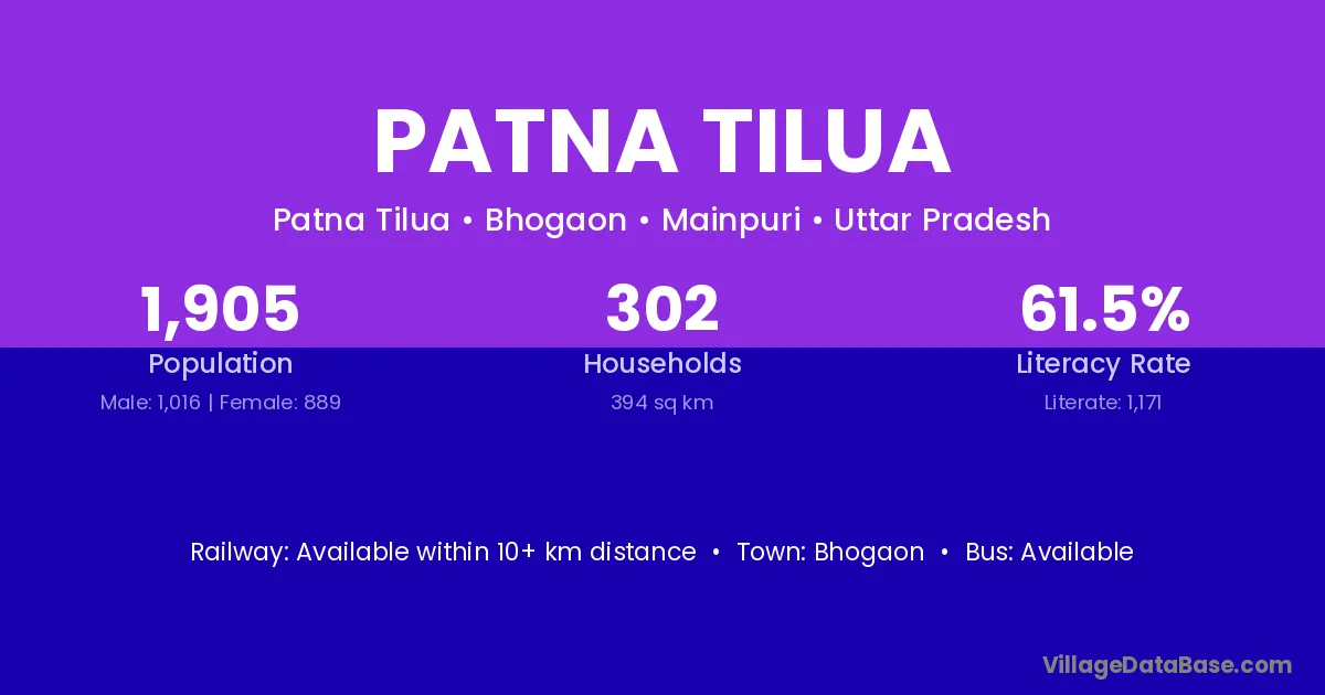 Patna Tilua village has a total population of 1,905 people, of which 1,016 are males and 889 are females.