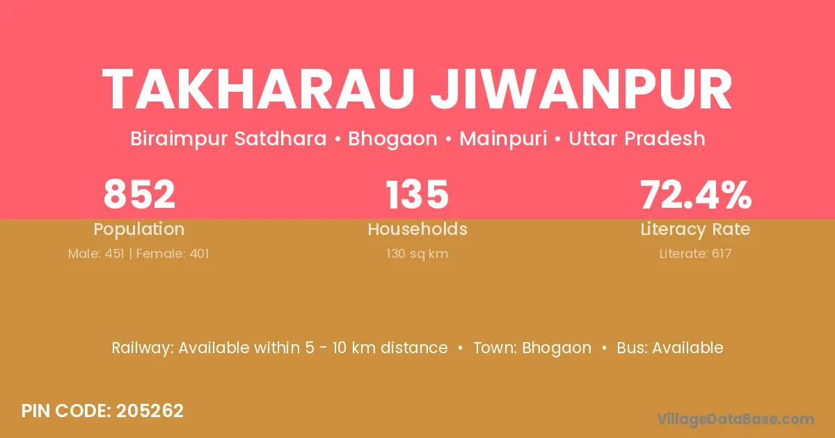 Takharau Jiwanpur village has a total population of 852 people, of which 451 are males and 401 are females.