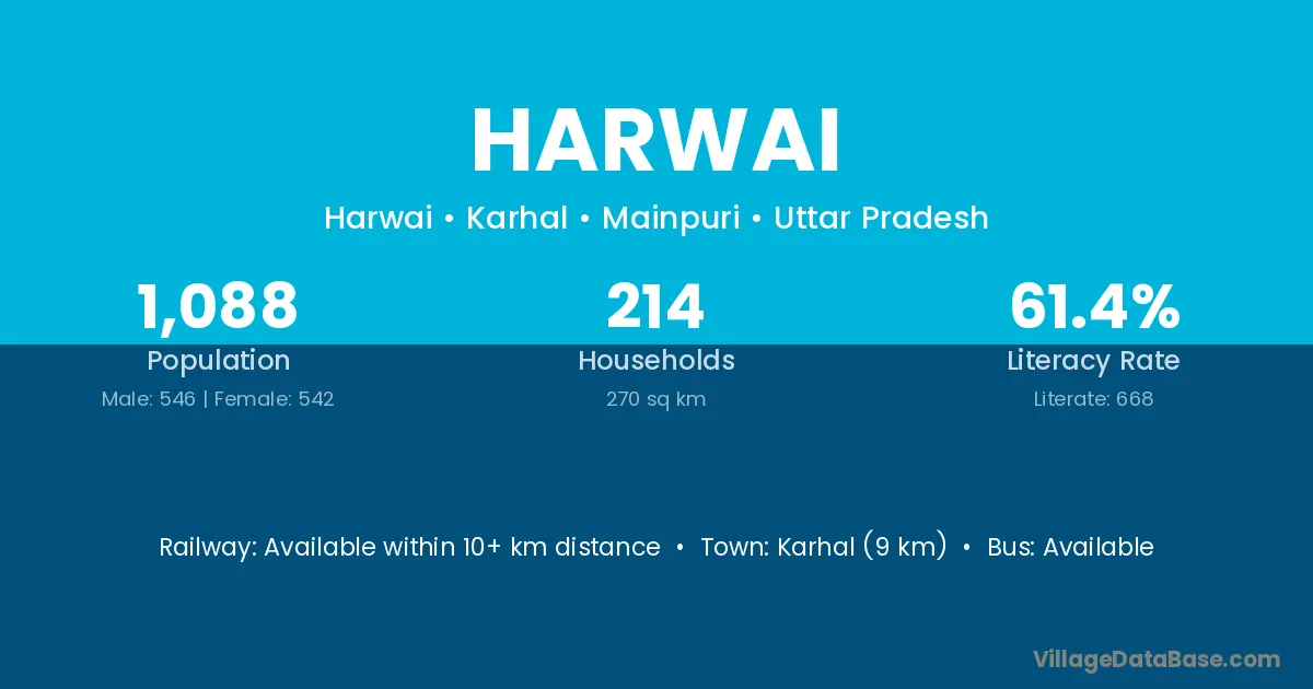 Karhal (9 km) is the nearest town to Harwai village for major economic activities and is located approximately 9 km away.