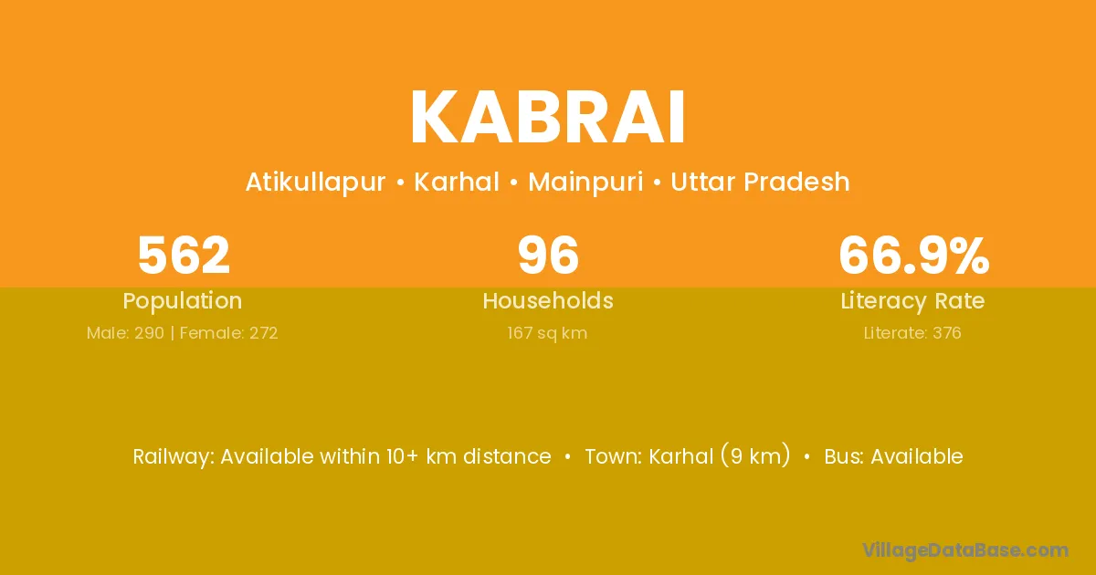Karhal (9 km) is the nearest town to Kabrai village for major economic activities and is located approximately 9 km away.