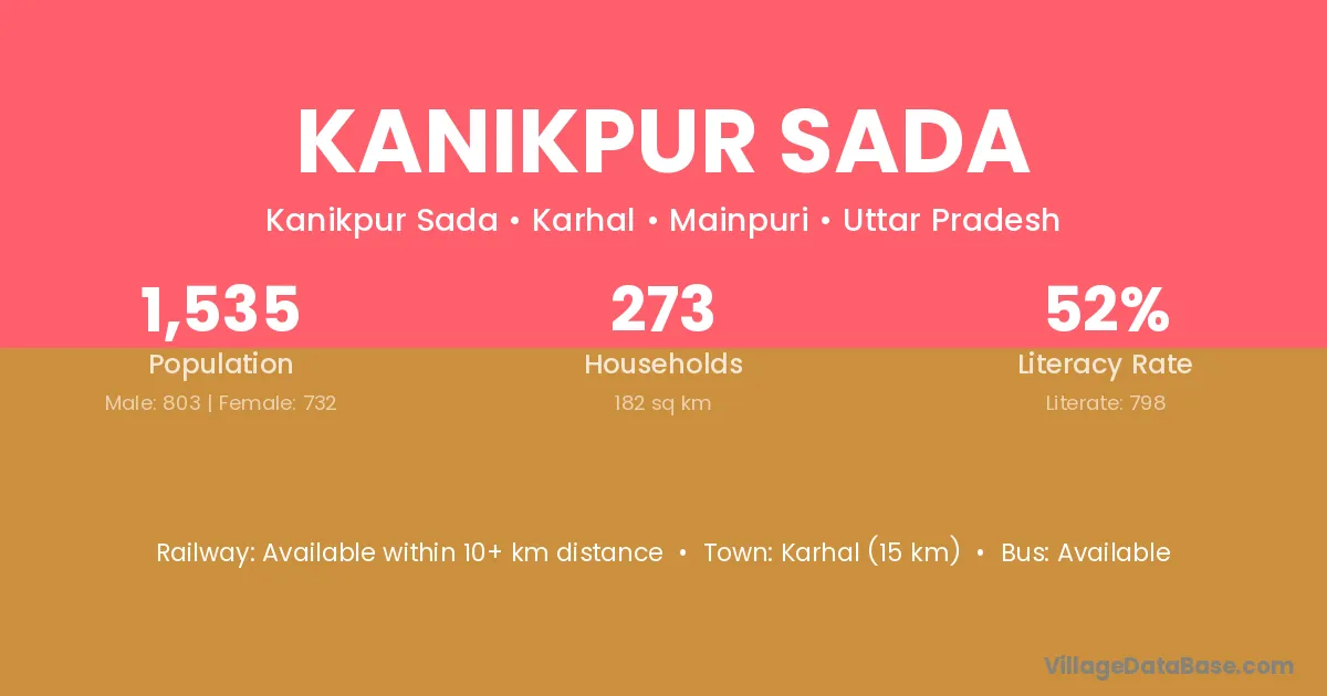 Karhal (15 km) is the nearest town to Kanikpur Sada village for major economic activities and is located approximately 15 km away.