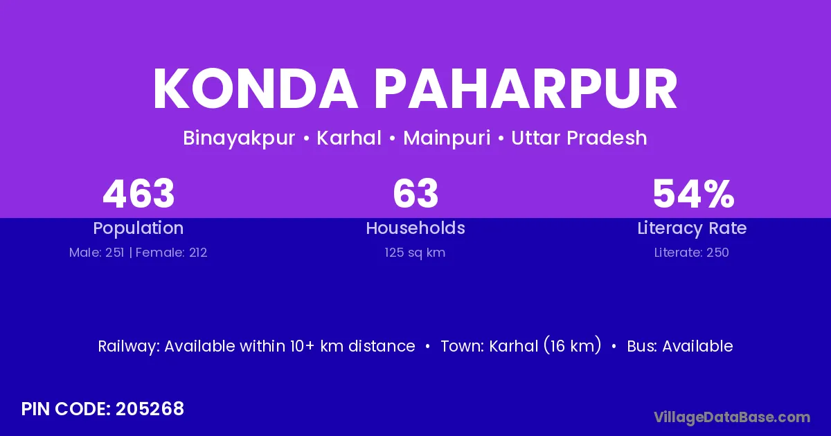 Karhal (16 km) is the nearest town to Konda Paharpur village for major economic activities and is located approximately 16 km away.