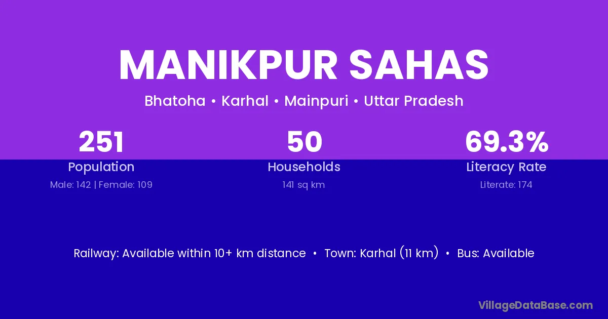 Karhal (11 km) is the nearest town to Manikpur Sahas village for major economic activities and is located approximately 11 km away.