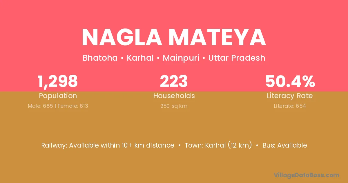 Karhal (12 km) is the nearest town to Nagla Mateya village for major economic activities and is located approximately 12 km away.