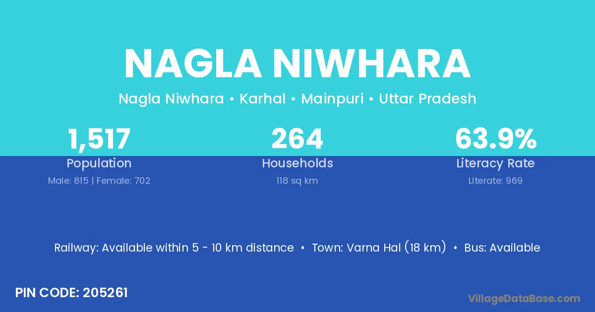 Varna Hal (18 km) is the nearest town to Nagla Niwhara village for major economic activities and is located approximately 18 km away.