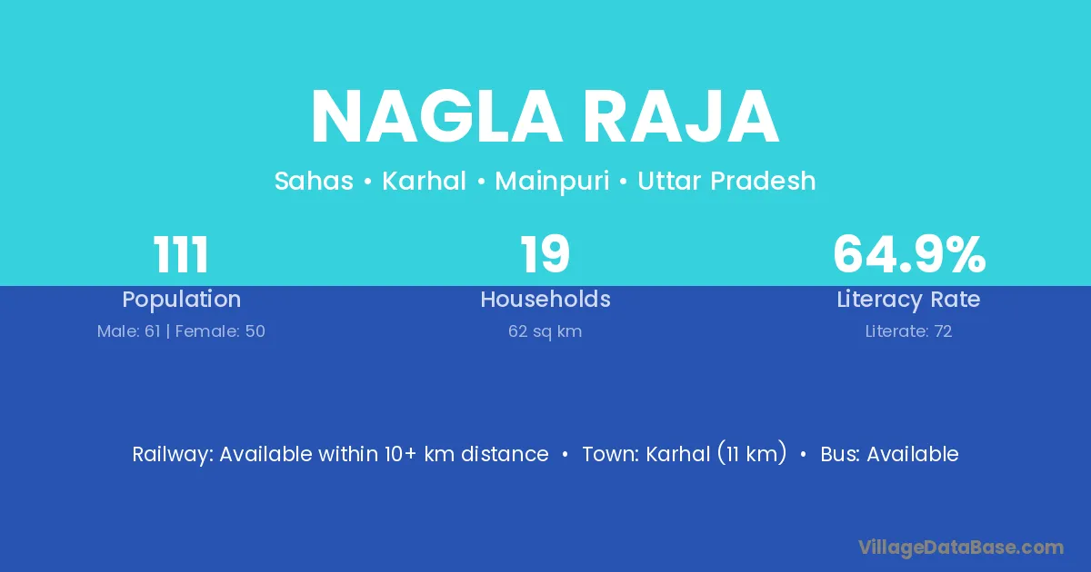Karhal (11 km) is the nearest town to Nagla Raja village for major economic activities and is located approximately 11 km away.