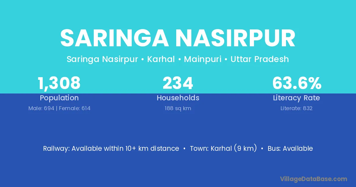 Karhal (9 km) is the nearest town to Saringa Nasirpur village for major economic activities and is located approximately 9 km away.