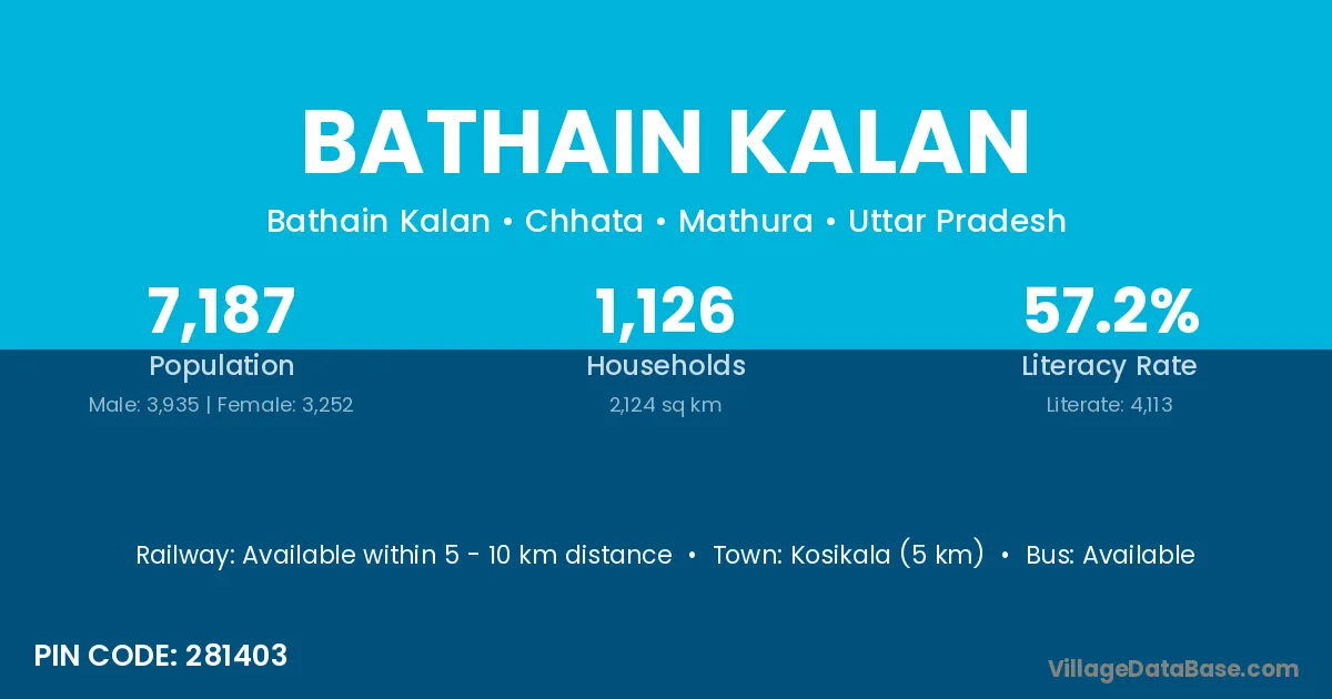 Kosikala (5 km) is the nearest town to Bathain Kalan village for major economic activities and is located approximately 5 km away.