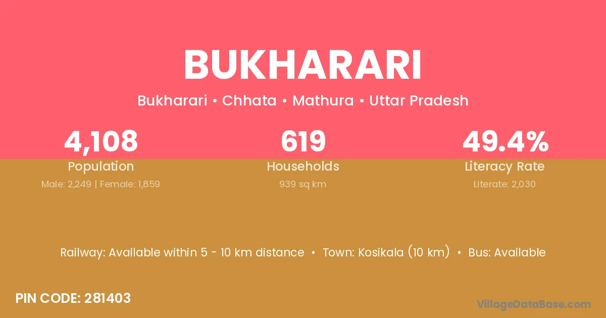 Kosikala (10 km) is the nearest town to Bukharari village for major economic activities and is located approximately 10 km away.