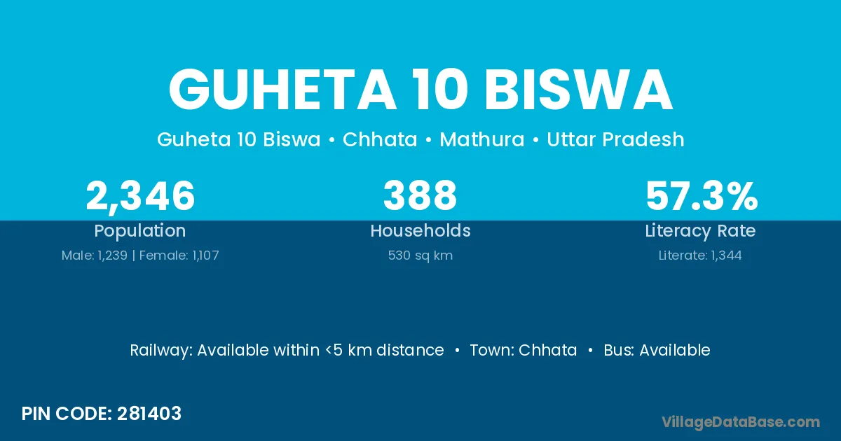 Guheta 10 Biswa village has a total population of 2,346 people, of which 1,239 are males and 1,107 are females.