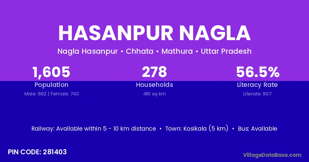 Kosikala (5 km) is the nearest town to Hasanpur Nagla village for major economic activities and is located approximately 5 km away.