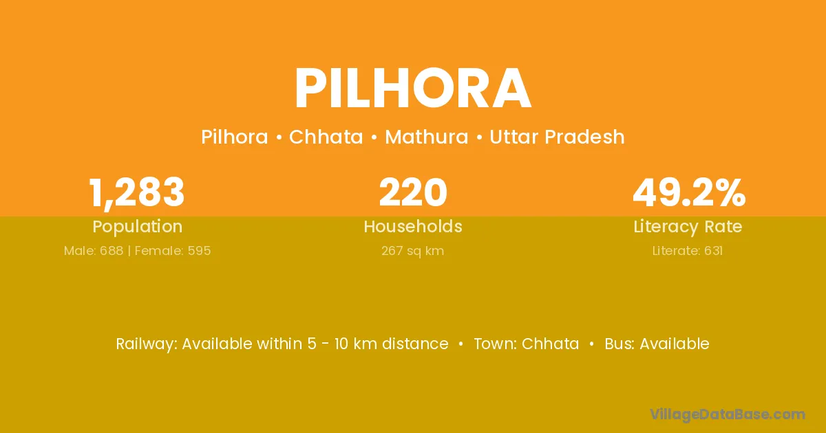 Pilhora village has a total population of 1,283 people, of which 688 are males and 595 are females.