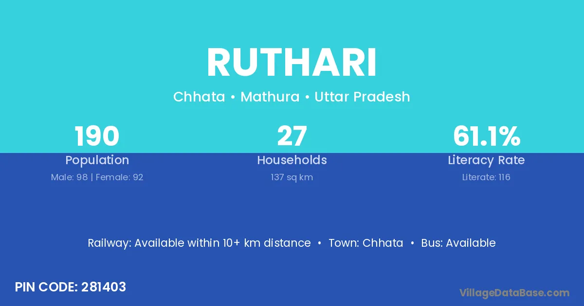 Ruthari village has a total population of 190 people, of which 98 are males and 92 are females.