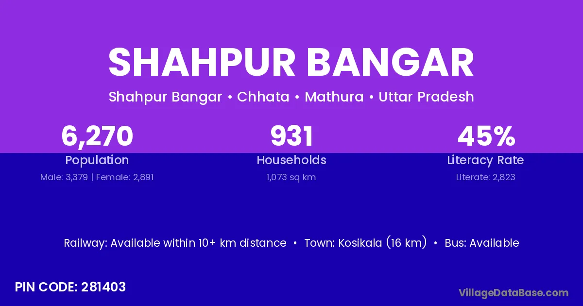 Kosikala (16 km) is the nearest town to Shahpur Bangar village for major economic activities and is located approximately 16 km away.
