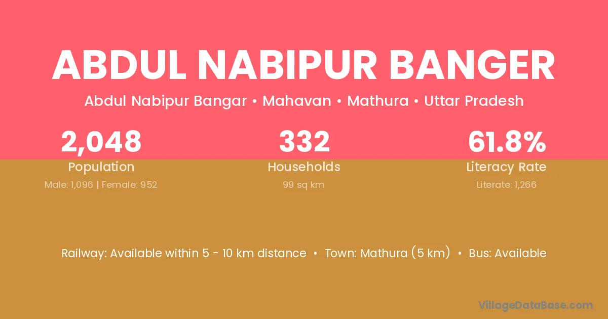 Mathura (5 km) is the nearest town to Abdul Nabipur Banger village for major economic activities and is located approximately 5 km away.