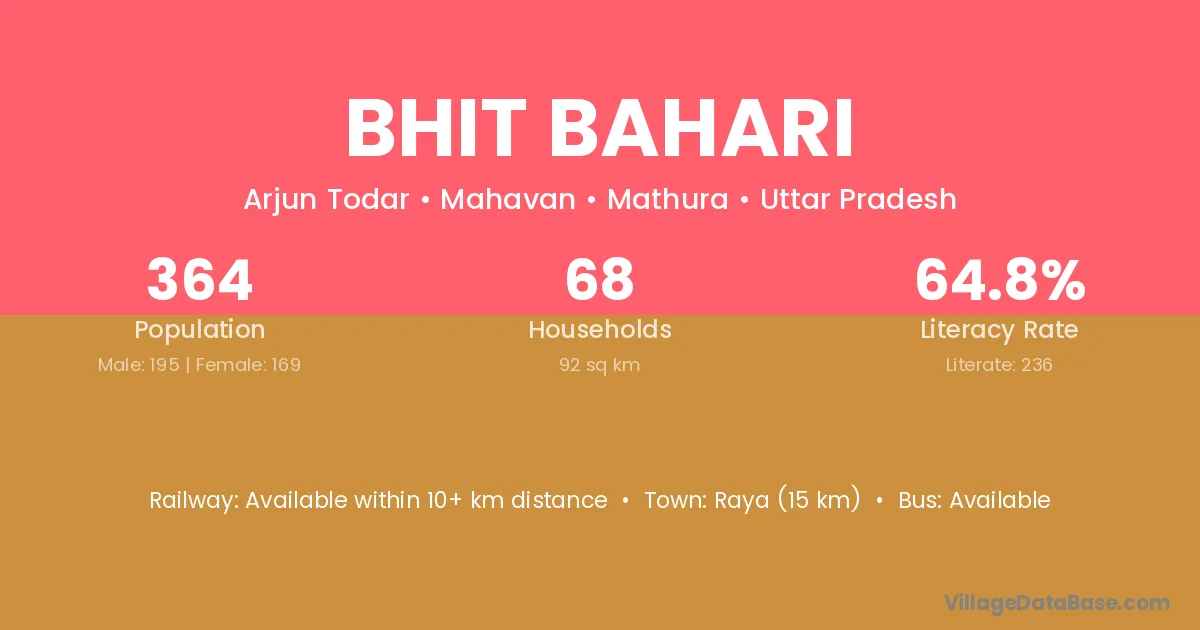 Raya (15 km) is the nearest town to Bhit Bahari village for major economic activities and is located approximately 15 km away.