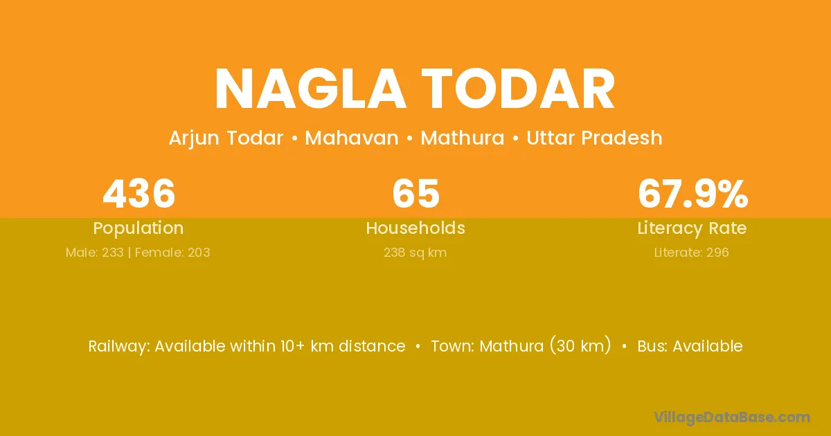 Mathura (30 km) is the nearest town to Nagla Todar village for major economic activities and is located approximately 30 km away.